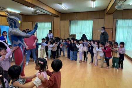 台風の影響により地域全体が大きな影響を受ける中で実現した今回の訪問に、保育園にいる子どもたちは大歓声でウルトラマンゼロを迎えてくれました。園内では体を動かすゲームや、写真撮影、ハイタッチなどを約30分間の交流が行われ、園内は笑顔と元気一杯の声に包まれました。